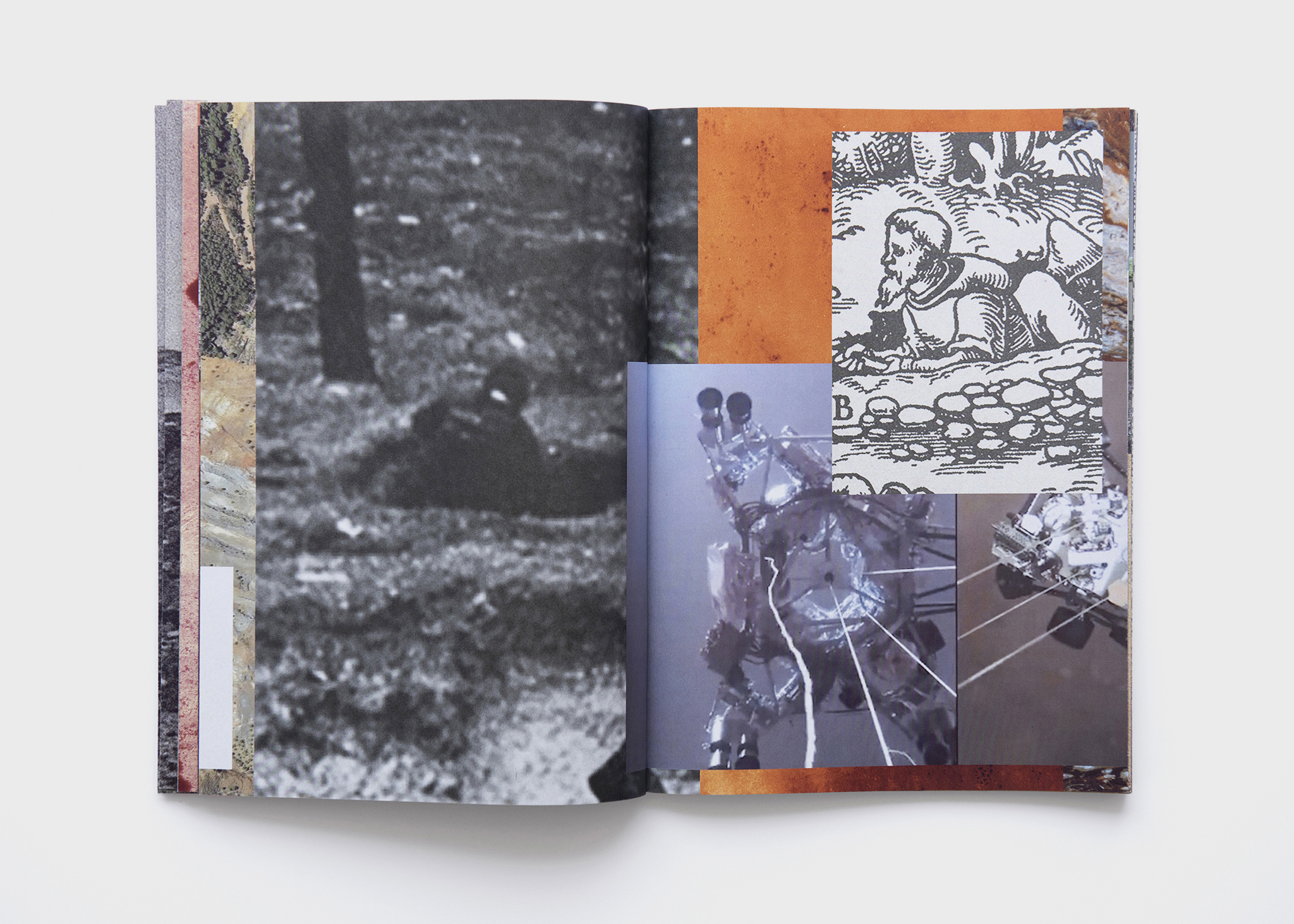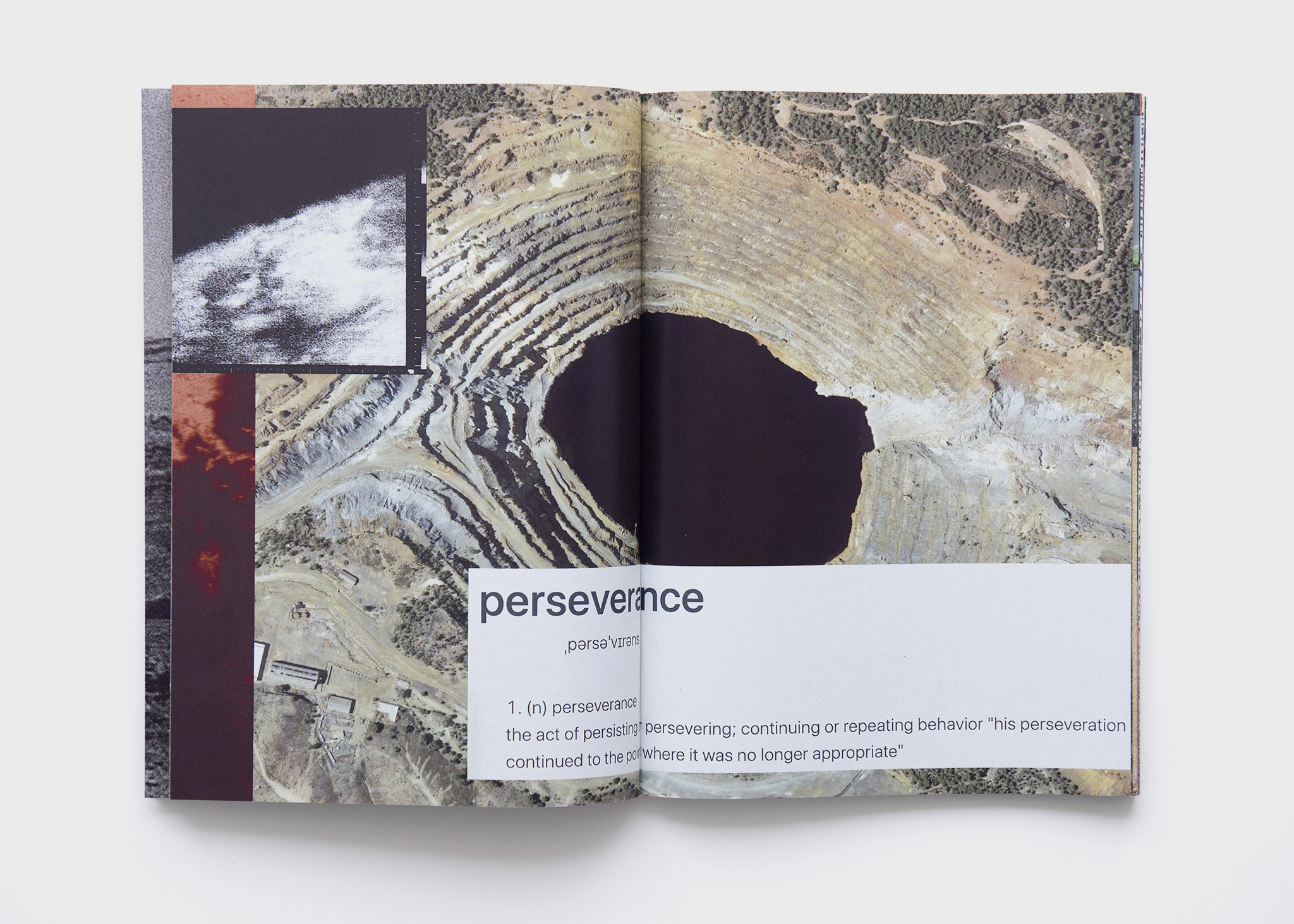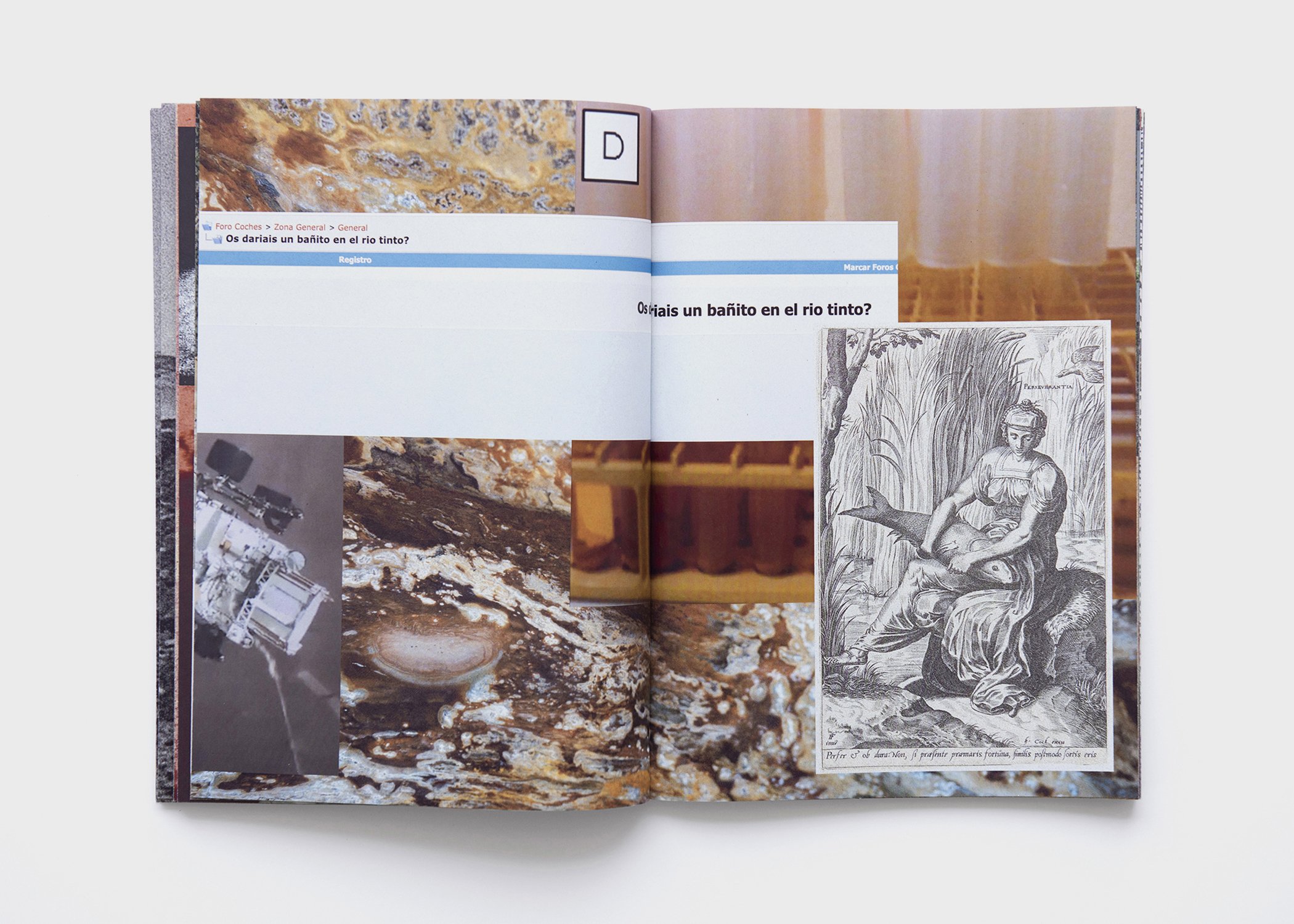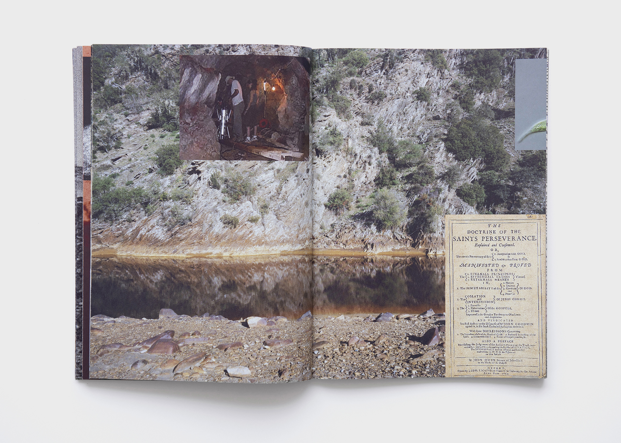The present edition creates an encounter between the traces of these multiple stories animated by the livings on site. Taken from John Milton’s Paradise Lost, the title of the book introduces ironically the human attitude towards the extraction of what is considered as natural ressources. The various traces –human bones, minerals, fossiles, bacteria, research engine of NASA– project the place of extraction into the exploration of space and in a perpetual quest for raw materials: they generate a narrative to be written. These elements are symbolically found in the flow of the river that gave this form to the layout.